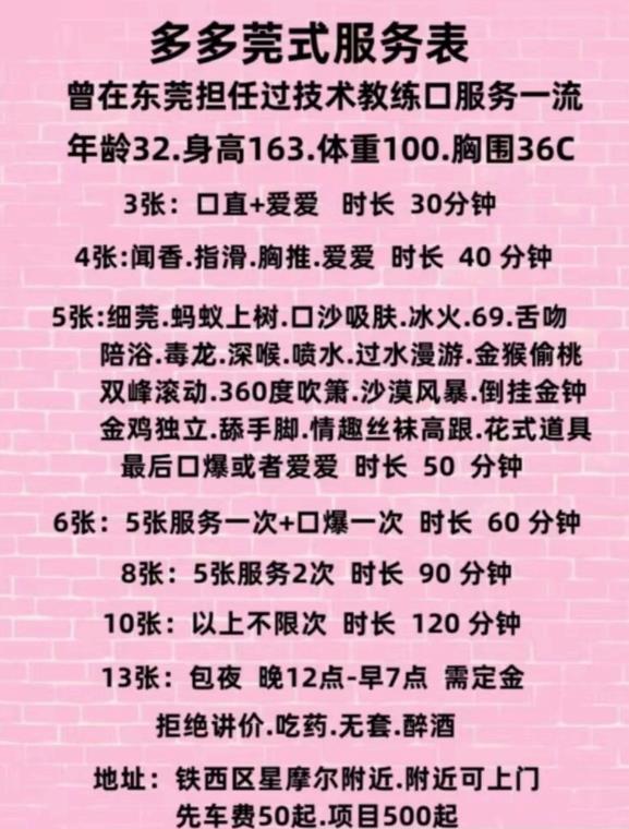 沈阳的一个小姐姐,去过好几次了,活绝对好。做莞式的项目。做的很细,屋里环境也好。几年没有换地方,应该是很安全,分享一下